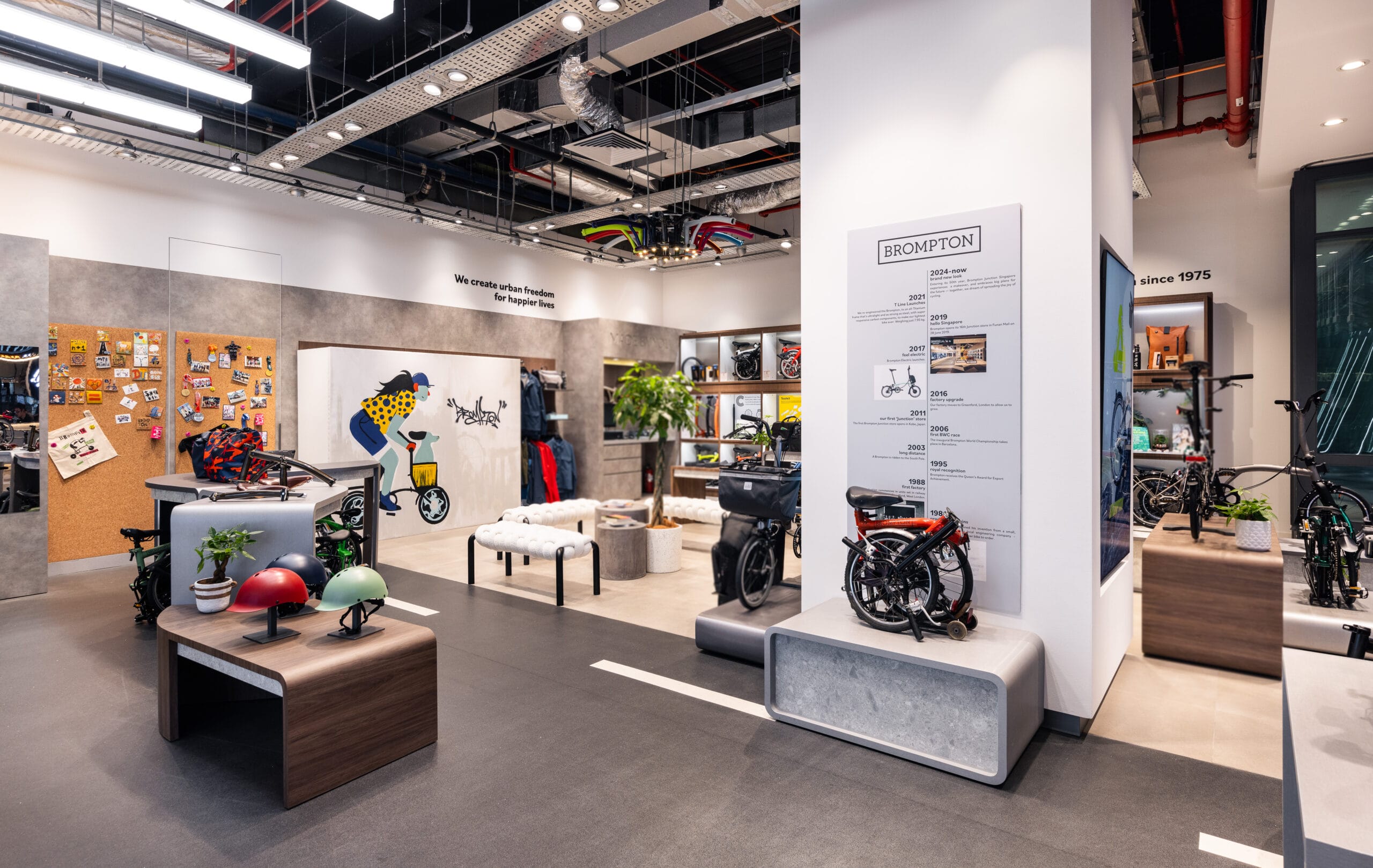 One standout feature is the bike testing lane, which allows customers to experience the bikes in action within the store. This unique addition brings the concept of “urban freedom” to life, allowing potential buyers to test the latest Brompton models before purchasing.